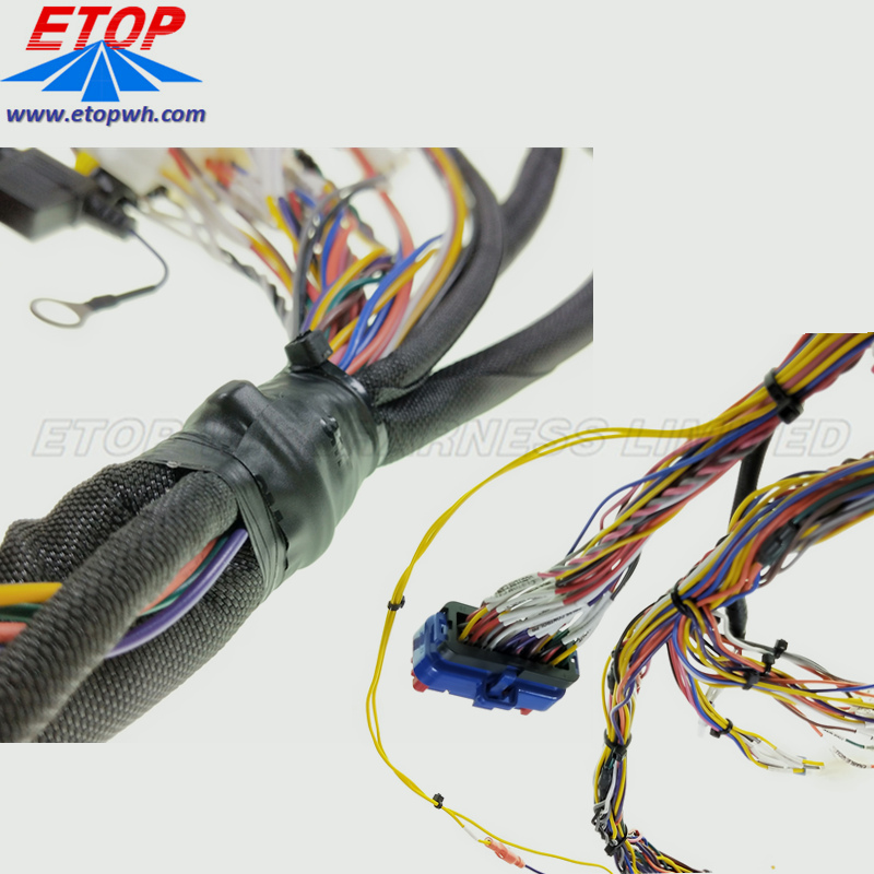 This OEM/ODM Wire Harness Assy With ECU Sealed Connector used for automobile industry. The type connector is original one by waterproof type with seal. The whole automotive cable assembly covered by corrugated tube for protection. Also fixed by 3M tape around the branching part. Related auto wires can be choosed as customer requirement, like AVSS, AVS, FLRY, TXL, GXL, etc