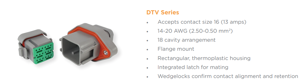 Custom DTV connectors can be designed to meet most applications, typical designs allow the following features to be specified: