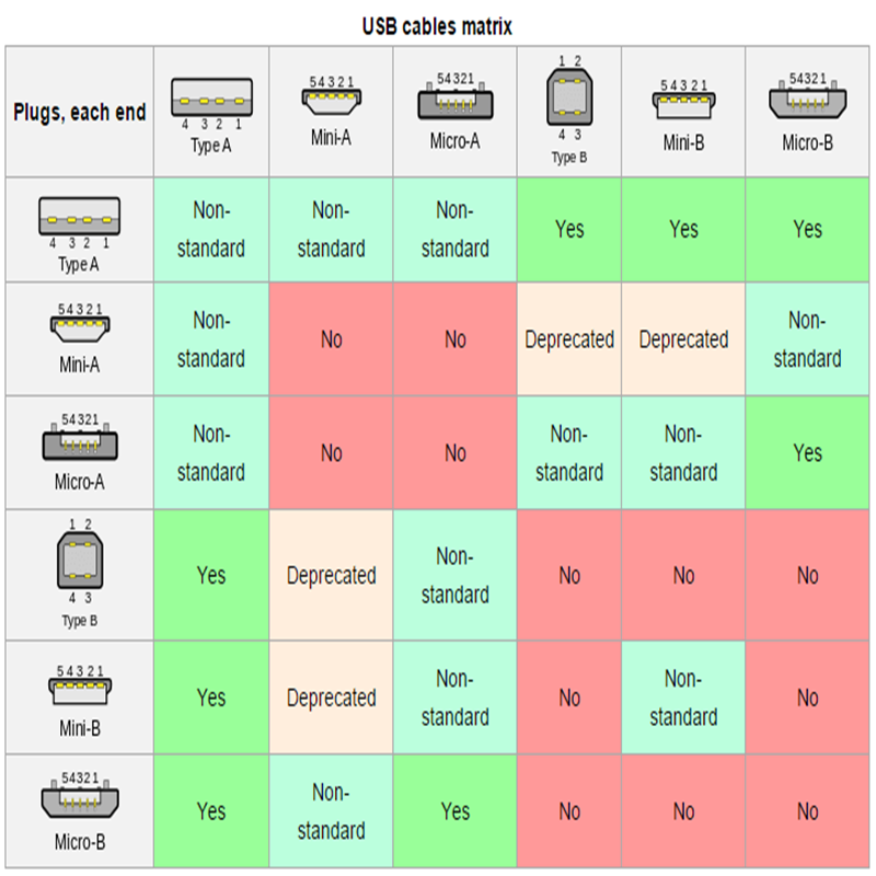 Cables will also have different combinations of plugs on each end, whether it may be an A-type or B-type plug. You can refer to this table matrix for different plug combinations.