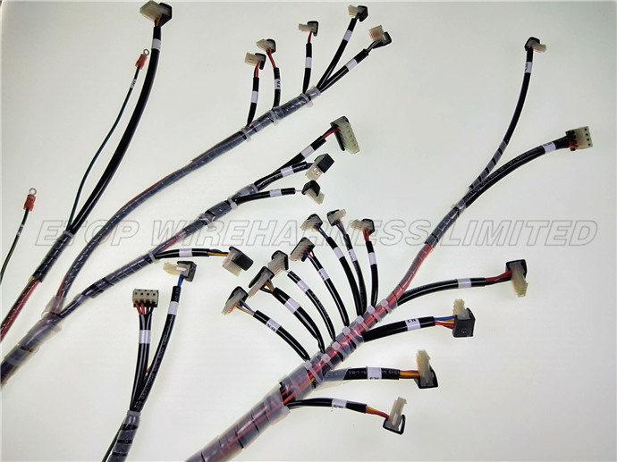 This complicated cable assemblies is special assembled with PANCON terminal block connectors, each branch marked with label for distinguish. The complete loom assembled on fixture by covering with PVC tube, spiral tube and tape. which purpose to make sure the loom is flexible enough. These block connectors are MAS-CON® .100" IDC Wire to Board Connector System, available in various type, straight and right angle.