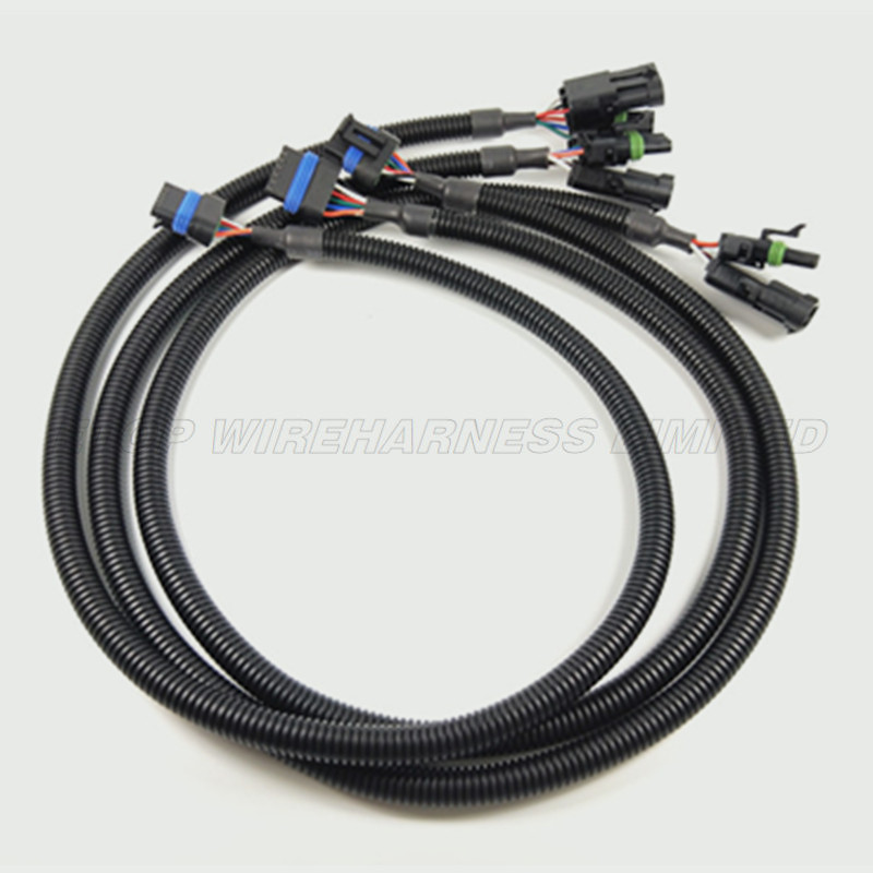 01 A Cable Harness, also known as a Wire Harness, Cable Assembly, wiring assembly or wiring loom, is an assembly of cables or wires which transmit signals or electrical power. The cables are bound together by straps,cable ties, cable lacing, sleeves,electrical tape, corrugated tube, a weave of extruded string, or a combination thereof. Commonly used in automobiles, as well as construction machinery, cable harnesses provide several advantages over loose wires and cables. For example, many aircraft, automobiles and spacecraft contain many masses of wires which would stretch over several kilometers if fully extended. By binding the many wires and cables into a cable harness, the wires and cables can be better secured against the adverse effects of vibrations, abrasions, and moisture. By constricting the wires into a non-flexing bundle, usage of space is optimized, and the risk of a short is decreased. Since the installer has only one harness to install (as opposed to multiple wires), installation time is decreased and the process can be easily standardized. Binding the wires into a flame-retardant sleeve also lowers the risk of electrical fires.